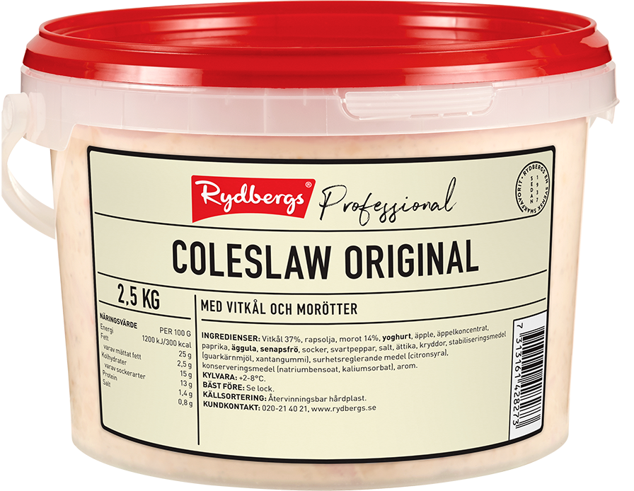 Vitkål, rapsolja, morot, YOGHURT, äpple, äppelkoncentrat, paprika, ÄGGULA, SENAPSFRÖ, socker, svartpeppar, salt, vinäger, ättika, kryddor, stabiliseringsmedel (guarkärnmjöl, xantangummi), surhetsreglerande medel (citronsyra), konserveringsmedel (natriumbensoat, kaliumsorbat).