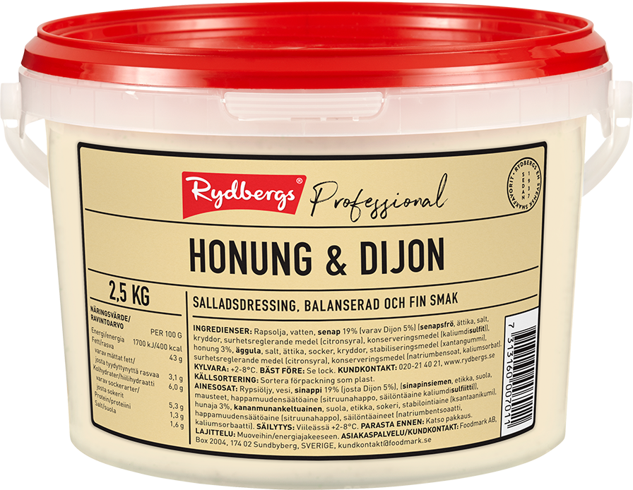 Rapsolja, vatten, SENAP 19% (varav Dijon 5%), (SENAPSFRÖ, ättika, salt, kryddor, surhetsreglerande medel (citronsyra), konserveringsmedel (kaliumdiSULFIT)), honung 3%, ÄGGULA, salt, ättika, socker, kryddor, stabiliseringsmedel (xantangummi), surhetsreglerande medel (citronsyra), konserveringsmedel (natriumbensoat, kaliumsorbat).