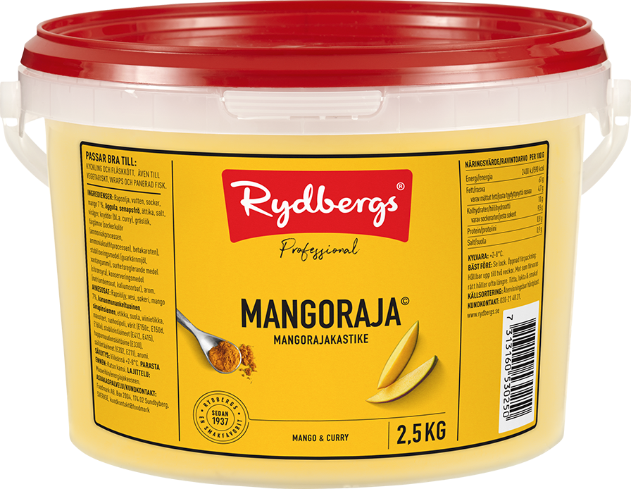 Exotisk dressing med spännande smak. Slät, krämig och populär dressing med en unik smak av curry och mango. Mangorajan passar perfekt till panerad fisk, grillad kyckling och annat ljust kött. Färdig att användas i en praktisk klämflaska.