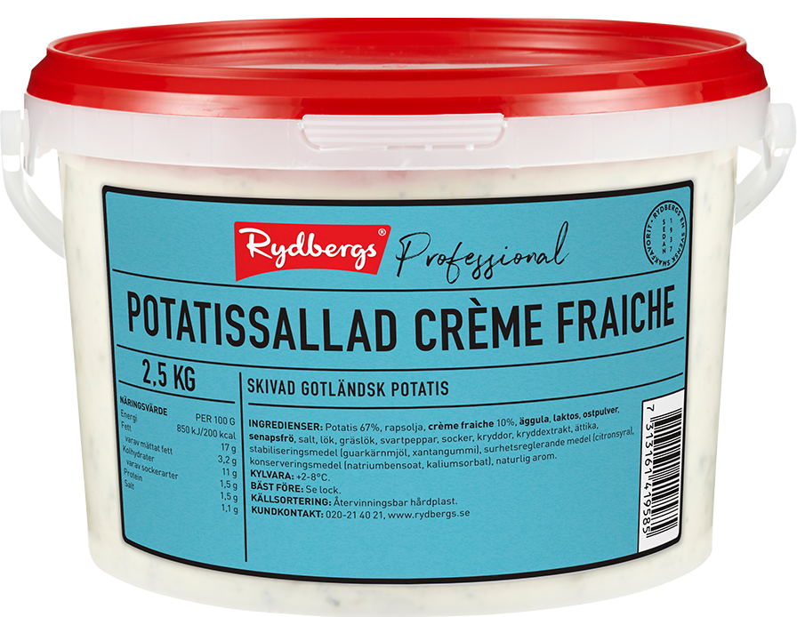 Potatis 67%, rapsolja, CRÈME FRAICHE 10%, ÄGGULA, LAKTOS, OSTPULVER, SENAPSFRÖ, salt, lök, gräslök, svartpeppar, socker, kryddor, kryddextrakt, ättika, stabiliseringsmedel (guarkärnmjöl, xantangummi), surhetsreglerande medel (citronsyra), konserveringsmedel (natriumbensoat, kaliumsorbat), naturlig arom.