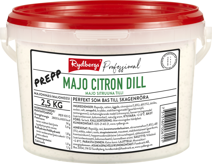 Rapsolja, vatten, ÄGGULA, citronjuice (1,8%), dill (1%), ättika, socker, salt, SENAPSFRÖ, kryddor, stabiliseringsmedel (guarkärnmjöl, xantangummi), surhetsreglerande medel (citronsyra), konserveringsmedel (natriumbensoat, kaliumsorbat), naturlig arom.